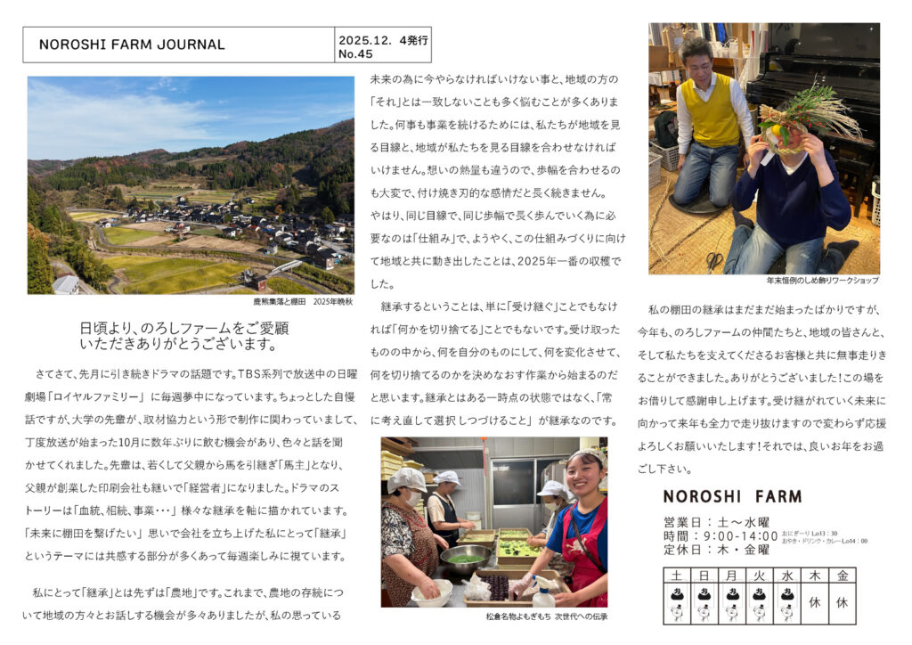 2025.12.08 Blog NOROSHI FARM JOURNAL 2025.12 TOPお知らせ・ブログNOROSHI FARM JOURNAL 2025.12 いつもご覧くださりありがとうございます。12月のJOURNALを更新しました。JOURNALはこちら(オンラインショップのブログ)からご覧ください! 鹿熊集落と棚田 2025年晩秋 この記事をシェアする PREVBACK TO LISTNEXT