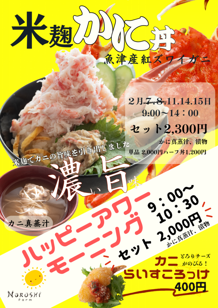 米麹カニ丼、カニクリームライスコロッケ、おにぎーり、おやき、こにぎーり弁当、お惣菜を販売致します!